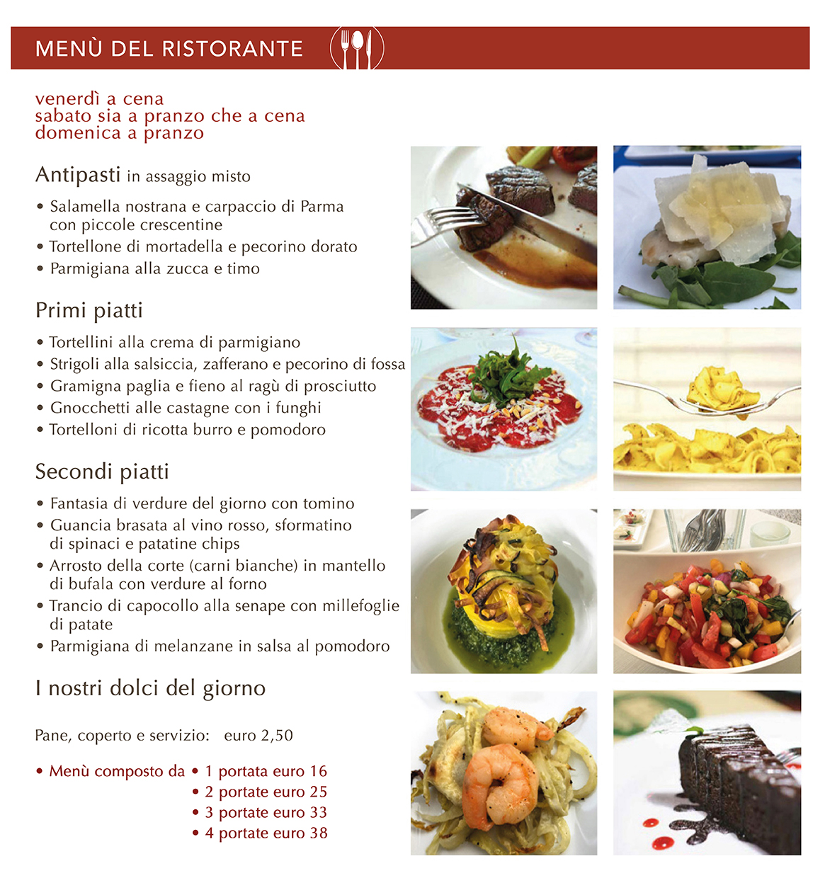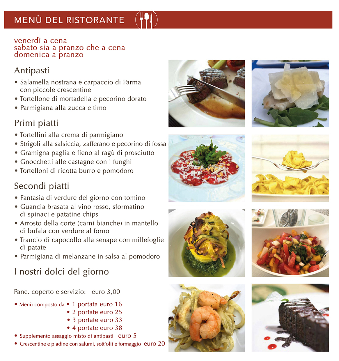 Oltre al menù alla carta vengono sempre proposti menù a degustazione stagionale. La cantina è ben fornita e offre un'ampia scelta di etichette differenti provenienti da tutta Italia; ampia anche la scelta di grappe e pregiati distillati.